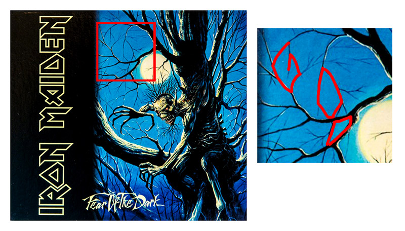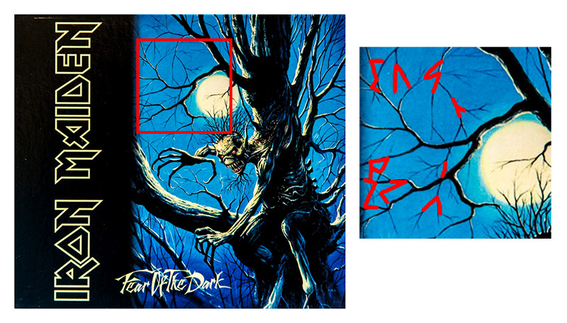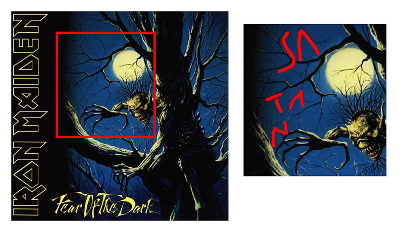 Sì che gli Iron Maiden, nel lontano 1982, incisero il disco The number of the beast [un titolo tutt’altro che subliminale] ma in questo caso la segnalazione assume connotati veramente ridicoli. A parte che l’intreccio di rami presenti nella copertina di Fear of the dark è squisitamente casuale, ma allora se proprio volessimo trovare dei messaggi nascosti, direi che a me piace assai di più l’idea che ci possa essere “god” [DIO].